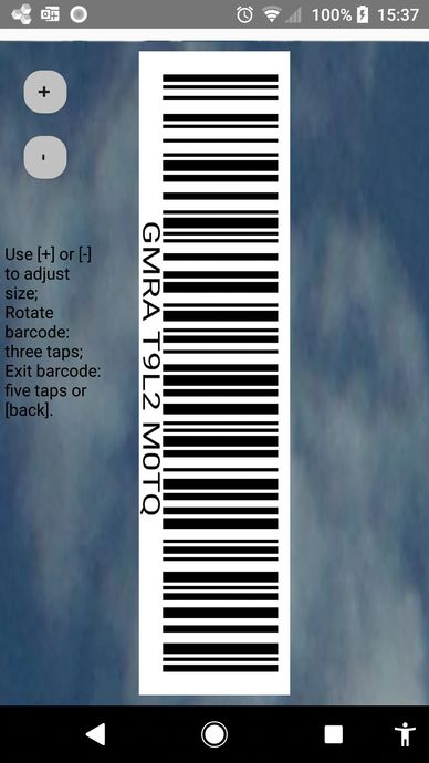 The device being used here is a 900x1200 phone so the barcode has been rotated to use the longest dimension of the screen. It is unlikely a device with less than 900px to use will be able to generate a valid barcode - the bars have three thicknesses for the scanner to read, if due to insufficient resolution the three types cannot be clearly seen the scan will fail. The barcode can be reduced in size as well if necessary for a particular scanner where the device has a very large screen.