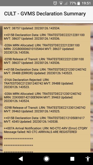The page above was generated by a sending a CTC Transit declaration request. Another login is not required for 18 months. CULT apps will keep each login active - for security when the app is closed all authentication tokens are removed.