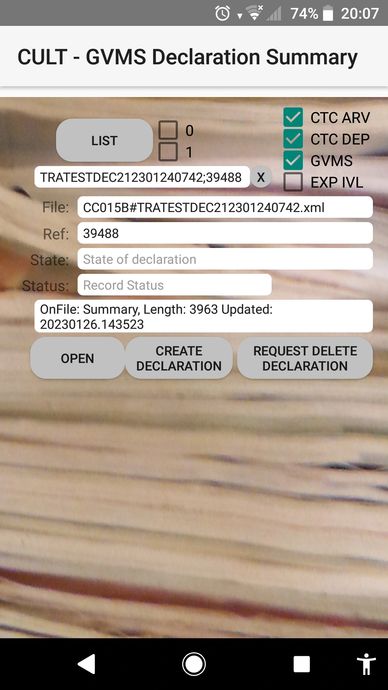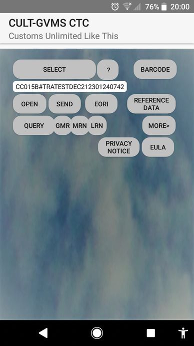 The GMR of the declaration currently being worked on is shown near the top of this page in File Name and on the home page. To find a record to work on: Tap [List]. Enter selection criteria into the box just under the List button, You may enter part of a declaration reference or message type (see glosery). Use the [X] button just after the selection criteria box to clear it. The current declaration's reference defaults into the selection box when a declaration is being worked on.